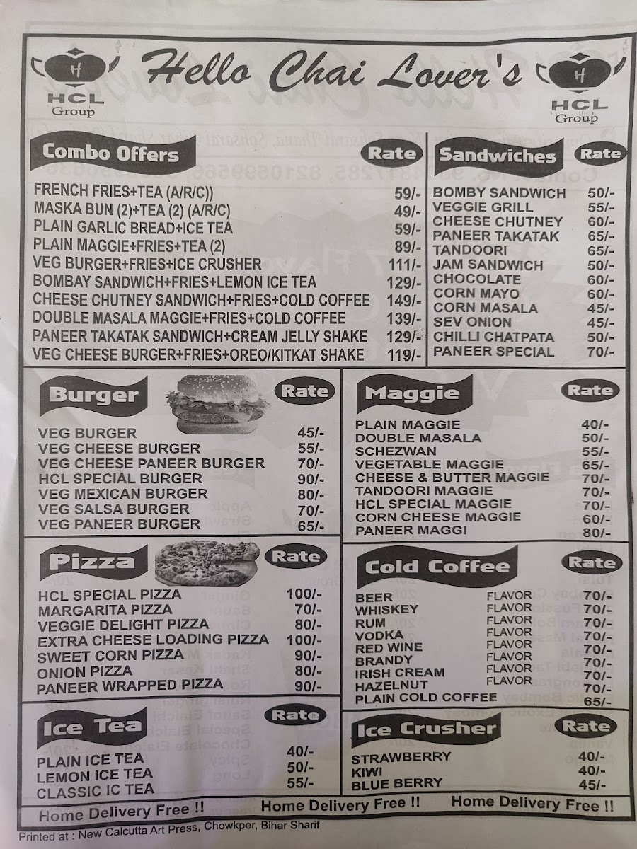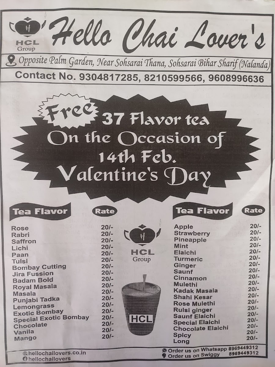 Welcome to Hello Chai Lover's, a delightful cafe located opposite Palm Garden in Sohsarai, Bihar Sharif. This cozy spot features an inviting menu that celebrates the art of tea with 37 unique flavors alongside delicious snacks and refreshments. Whether you're a traditional chai enthusiast or looking to explore exotic blends, there’s something for everyone.